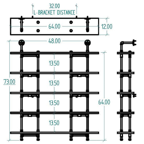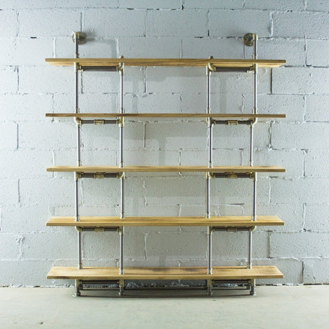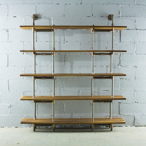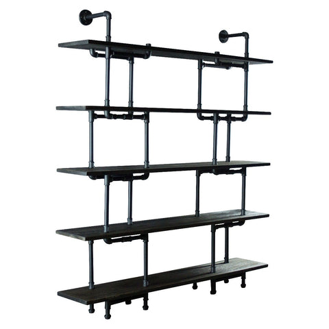As eye-catching as it is functional the Eugene 5-Shelf Pipe bookcase/etagere melds the beauty of fine-grain reclaimed/aged finished sustainable solid wood with the edginess of industrial vintage metal. It features a lightweight easy to assemble 5-tier shelf design offering ample space for all your favorite collectibles books candles and plants. Each shelf is crafted from reclaimed/aged finished sustainable solid Paulownia (lightest to strongest ratio wood species in the world) wood! Giving structure and stability to the bookcase is an illusion of a multi-dimensional pipe frame made from aircraft-grade recyclable aged aluminum and flash plated fittings. The flanges contain two display screws and two real to minimize mounting time. The difference is four total holes in the wall verses eight. If extra stability is needed the display screws can be removed and then screwed fully into the wall. This expertly crafted pipe bookcase makes a striking and purposeful addition to any industrial vintage or modern style loft studio or office. Choose from three options of fine metal finishes to suit your decor and individual style. With a low VOC finish recyclable metals sustainable wood and 100% recyclable packaging your home and planet are sure to beam a healthy smile in approval!