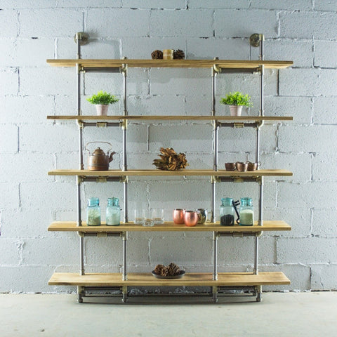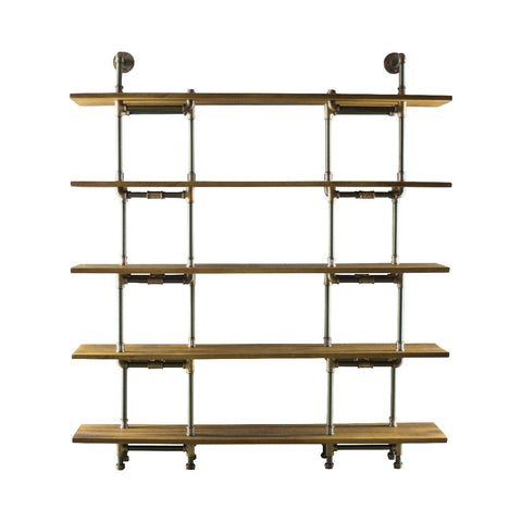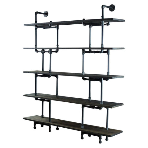As eye-catching as it is functional the Eugene 5-Shelf Pipe bookcase/etagere melds the beauty of fine-grain reclaimed/aged finished sustainable solid wood with the edginess of industrial vintage metal. It features a lightweight easy to assemble 5-tier shelf design offering ample space for all your favorite collectibles books candles and plants. Each shelf is crafted from reclaimed/aged finished sustainable solid Paulownia (lightest to strongest ratio wood species in the world) wood! Giving structure and stability to the bookcase is an illusion of a multi-dimensional pipe frame made from aircraft-grade recyclable aged aluminum and flash plated fittings. The flanges contain two display screws and two real to minimize mounting time. The difference is four total holes in the wall verses eight. If extra stability is needed the display screws can be removed and then screwed fully into the wall. This expertly crafted pipe bookcase makes a striking and purposeful addition to any industrial vintage or modern style loft studio or office. Choose from three options of fine metal finishes to suit your decor and individual style. With a low VOC finish recyclable metals sustainable wood and 100% recyclable packaging your home and planet are sure to beam a healthy smile in approval!