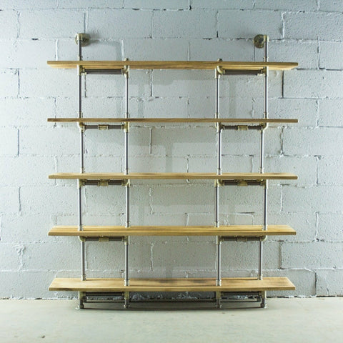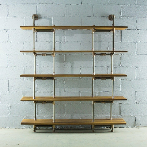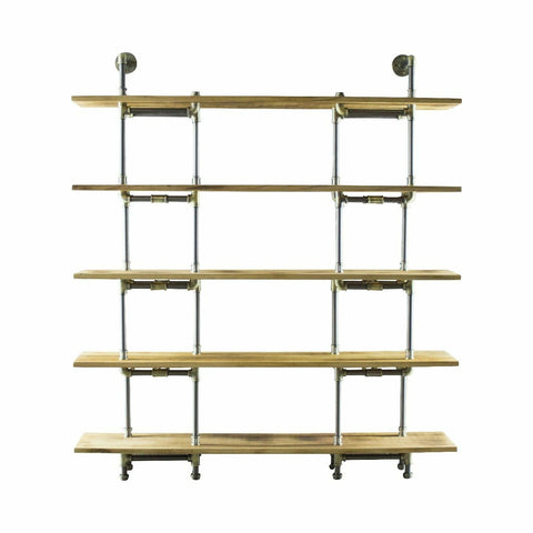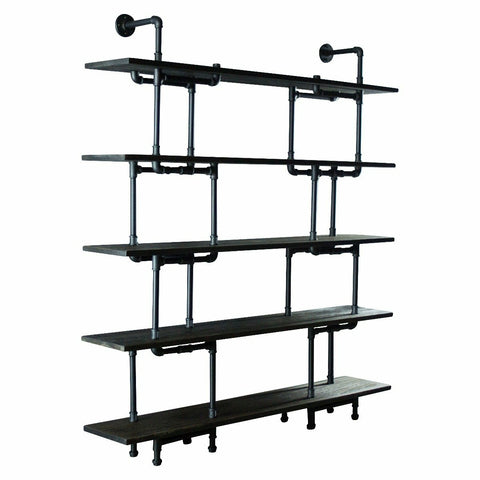 As eye-catching as it is functional the Eugene 5-Shelf Pipe bookcase/etagere melds the beauty of fine-grain reclaimed/aged finished sustainable solid wood with the edginess of industrial vintage metal. It features a lightweight easy to assemble 5-tier shelf design offering ample space for all your favorite collectibles books candles and plants. Each shelf is crafted from reclaimed/aged finished sustainable solid Paulownia (lightest to strongest ratio wood species in the world) wood! Giving structure and stability to the bookcase is an illusion of a multi-dimensional pipe frame made from aircraft-grade recyclable aged aluminum and flash plated fittings. The flanges contain two display screws and two real to minimize mounting time. The difference is four total holes in the wall verses eight. If extra stability is needed the display screws can be removed and then screwed fully into the wall. This expertly crafted pipe bookcase makes a striking and purposeful addition to any industrial vintage or modern style loft studio or office. Choose from three options of fine metal finishes to suit your decor and individual style. With a low VOC finish recyclable metals sustainable wood and 100% recyclable packaging your home and planet are sure to beam a healthy smile in approval!