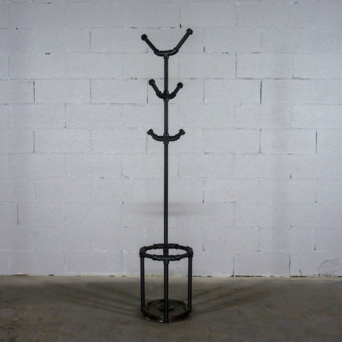 For those accustomed to occupying small spaces you'll appreciate the intelligent space-saving capabilities of our pipe coat rack tree. It is incredibly easy to assemble and is expertly crafted in the true durable and industrial vintage style! The Frame is comprised of aged recyclable aircraft-grade aluminum pipes and the base from sustainable reclaimed/aged finished solid Paulownia (lightest to strongest ratio wood species in the world) wood. The pipe coat rack tree features include three tiers of storage an umbrella stand on the bottom six hooks ideal for hanging hats scarves purse and coats above. Select from three finish options to match the pipe coat rack tree with your decor. With a low VOC finish recyclable metals sustainable wood and 100% recyclable packaging your home and planet are sure to beam a healthy smile in approval!